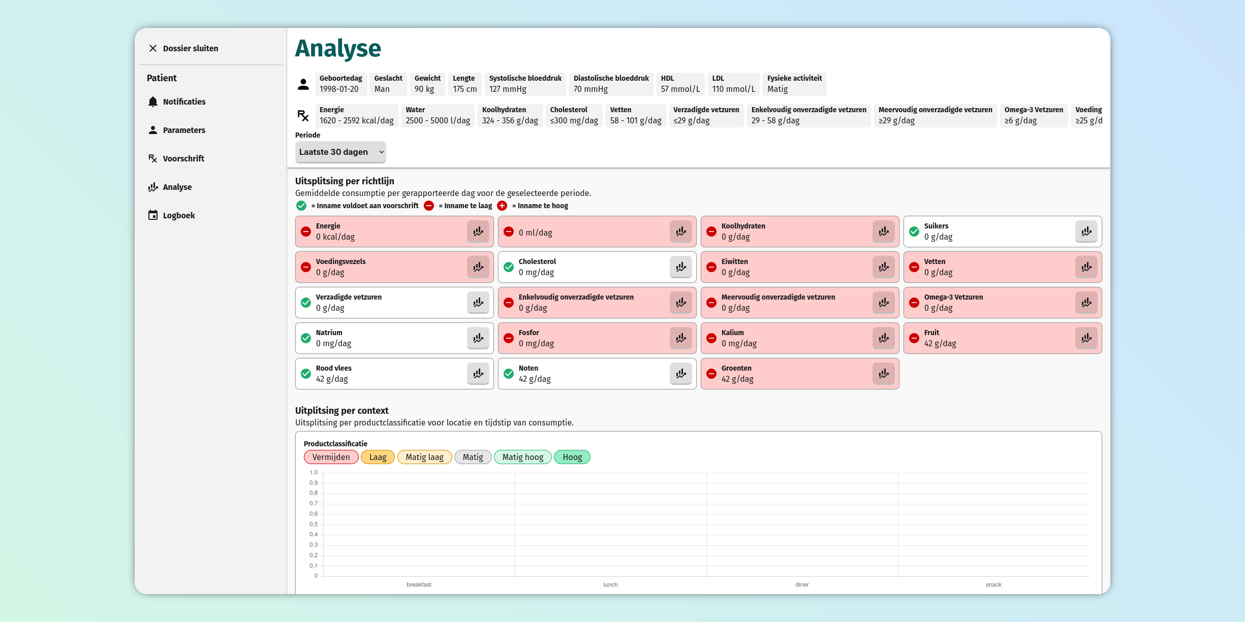 - Beslissingsondersteunend systeem: Automatische suggesties voor nutritie- en productvoorschriften, gebaseerd op de nieuwste cardiovasculaire richtlijnen.